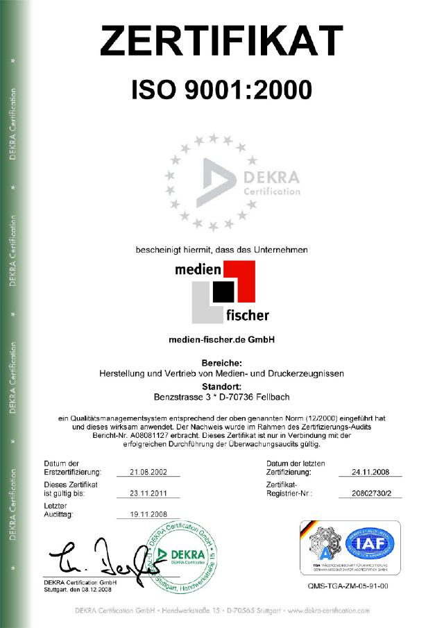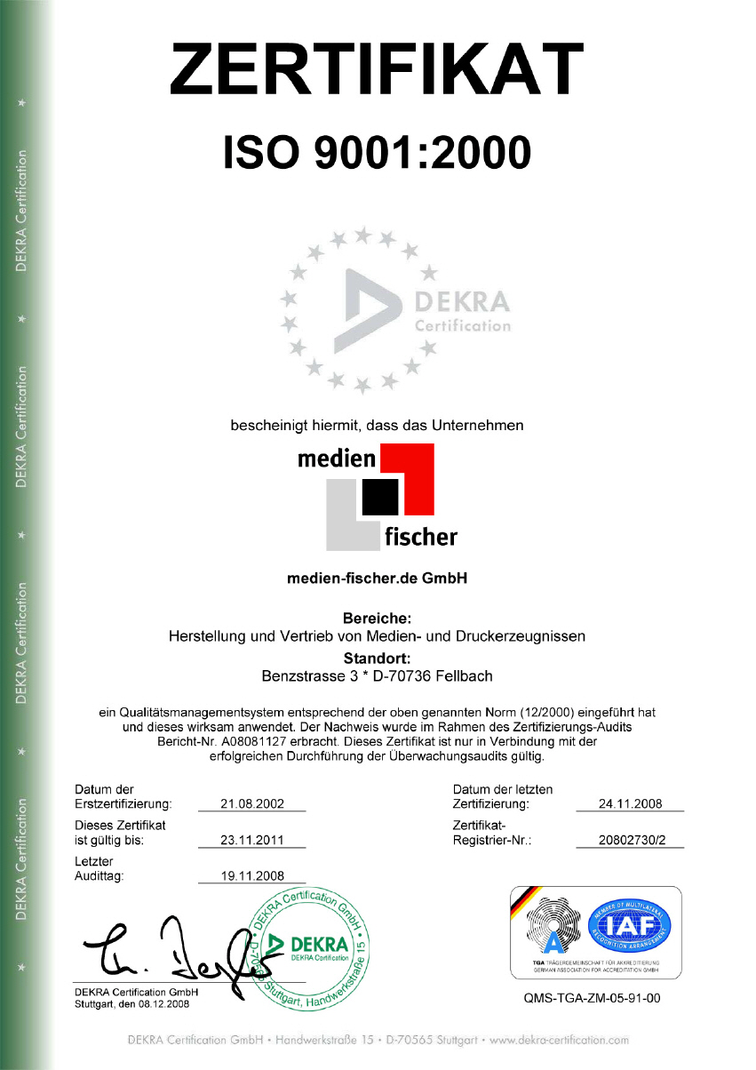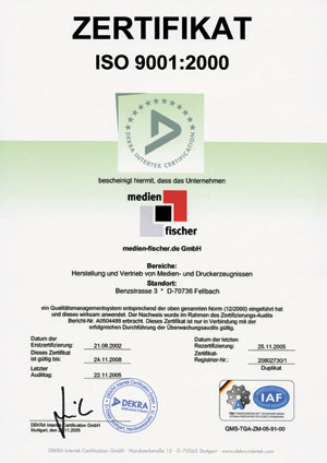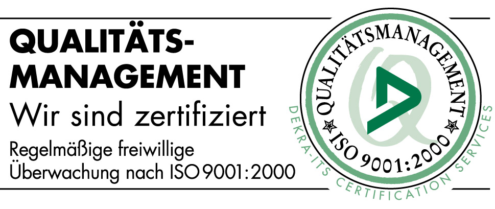Unser Qualitätsmanagementsystem erfüllt die Anforderungen der Norm DIN EN ISO 9001:2000 nun schon seit der Zertifizierung im Juli 2002. Seitdem werden die Wirksamkeit und der Fortschritt in Überwachungsaudits regelmäßig jährlich durch die DEKRA Certification GmbH überprüft.