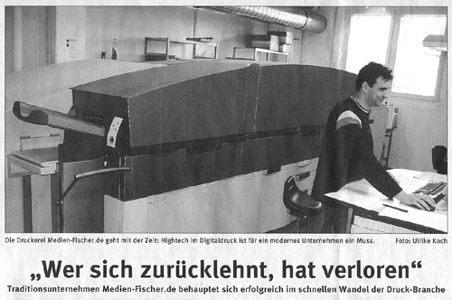 Ein wenig versteckt im Gewerbegebiet tritt die Druckerei medien-fischer.de nach außen sehr zurückhaltend in Erscheinung. Im Inneren verbirgt sich jedoch Hightech auf höchsten Niveau. Das bereits seit 40 Jahren in Oeffingen ansässige Familienunternehmen zählt heute zu den führenden Mediendienstleistern im Raum Stuttgart. Der neue Name medien-fischer.de, den sich die Offset-Druckerei Fritz Fischer gegeben hat, spricht für ein innovatives Firmenkonzept. Denn deren Leistungsspektrum geht inzwischen weit über den reinen Offset-Druck hinaus. „Wer denkt, er kann sich ausruhen, der hat verloren", sagt Geschäftsführer. Unter seiner Federführung hat sich die Druckerei zu einem modernen Unternehmen entwickelt. Digitaler Laserdruck, Mediendatenbanken und selbst Nischenprodukte wie „Book On Demand" gehören für ihn längst zum Standard. Die neue Technik ermöglicht Kleinstauflagen in hoher Qualität, eine schnelle Auftragsabwicklung und darüber hinaus internetgestützte Dienstleistungen, die für die Kunden von zunehmender Bedeutung sind. Die neuen Medien sind für den Druckereibetrieb zu einem wichtigen Betätigungsfeld geworden. medien-fischer.de hat sich darauf spezialisiert, Marketingdatenbanken zu erstellen sowie Strategien und Konzepte für den Internetauftritt zu entwickeln. Mittels Passwort können so Kommunikationsdaten über Internet weltweit abgerufen werden. Die Digitalisierung ermöglicht den Mitarbeitern gleichzeitig, Druckaufträge in nur wenigen Stunden zu realisieren. Mit dem neu eingerichteten "Print4media"- Verfahren kann der Kunde seine Druckvorlagen selbst via Internet aktualisieren. Ein Mausklick lässt den Auftrag in Druck gehen. Der Kunde hat dadurch den Vorteil, dass seine Daten stets auf dem neuesten Stand sind, Gedruckt wird nach Bedarf. Eine aufwendige Lagerhaltung ist mit diesem System nicht mehr notwendig. Für Großaufträge unterhält das Unternehmen aber auch ein Lager, aus dem die gewünschte Menge an Druckerzeugnissen jederzeit abgerufen werden kann. Trotz der technischen Neuerungen wird Beratung bei medien-fischer.de groß geschrieben. Spezialisierte Mediengestalter sind kompetente Ansprechpartner in allen Fragen. Ob es sich nun um Geschäfts Ausstattungen, Informationsbroschüren oder Abizeitungen, Dissertationen und Bewerbungsunterlagen handelt, sowohl Groß- als auch Kleinkunden können die Vorteile des flexiblen Unternehmens, dessen Stärke in der langjährigen Erfahrung und im innovativen Service liegt, für sich nutzen.